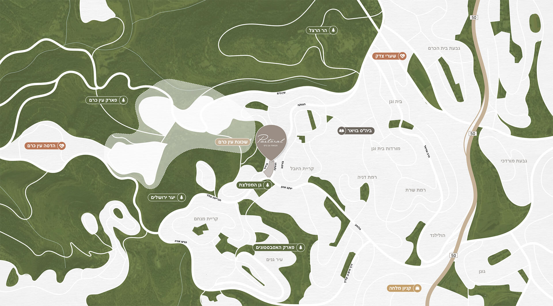 פרויקט פסטורל ממוקם בדרום-מערב העיר, סמוך לעין כרם ולקריית היובל, במיקום אידיאלי: קרוב לתחנת הרכבת הקלה ועם גישה מהירה אל צירי התנועה המרכזיים. הפרויקט נמצא בסמיכות לפארקים רחבי ידיים ובקרבה רבה למוסדות חינוך מובילים. כל זה עטוף בנוף הפסטורלי של עין כרם, כאשר הפרויקט נמצא במיקום גבוה ונהנה מכל הנוף הפתוח והמרהיב.